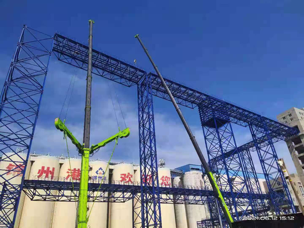 蓝天的映衬下,桁架在两台汽车吊的牵引下平稳上升,起吊、提升、转身、下降、校对,桁架稳稳落在立柱上。“完美!”现场人员一片欢呼。在场的建设单位、监理单位人员不禁称赞道“河北四建的大型钢结构安装也不错,真不愧是有品质、有实力的国企大企!”